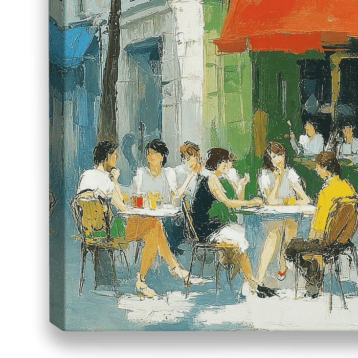 Details: terras schilderij, restaurant schilderij, gezelligheid, kleurrijke gebouwen, mensen,…