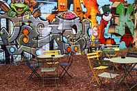 Bistro terrasje met houtsnippers en Franse bistrostoelen en een muur van graffiti in de hippe multiculture wijk Norrebro in wereldstad Kopenhagen (Kobenhavn, Copenhagen), Denemarken, Denmark. In dit artistieke deel van de Deense stad vind je veel kleurrijke Contemporary Street art, moderne streetart, hedendaagse kunst en…