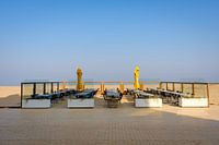 Een leeg terras aan de dijk op het strand van Koksijde (België) op een vroege ochtend.