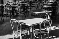 Terras met tafels en stoelen in zuilengalerij in Acqui Terme in Piemonte, Italië