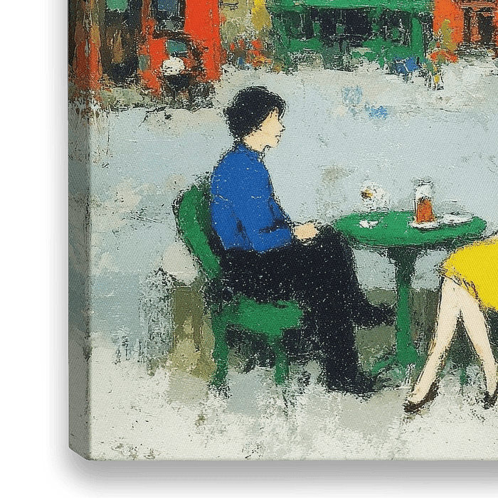 Terras met vrouw - Dit schilderij toont een vrouw in een gele jurk die op een terras zit tegenover een man, met een levendige stadsscene op de achtergrond.