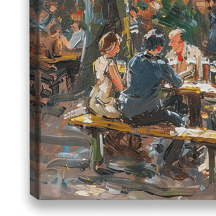 Deze afbeelding toont een levendige buitentuin van een café of restaurant. Mensen zitten aan tafels, sommigen in gesprek, anderen genieten van hun drankjes.