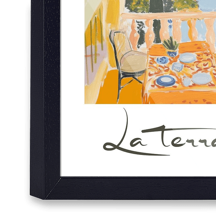 Een reisposter van "La terrasse" in de stijl van Henri Matisse, met het terras dat uitkijkt over de Croisette en de Middellandse Zee, met een theetafel in Matisse en fauvistische kleuren.