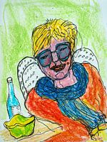 Dit levendige portret is getekend in kleurpotlood en inkt, in een vrije, expressieve stijl die doet denken aan schetsen uit een kunstenaarsdagboek. De losse lijnen, overlappende contouren en felle kleurvlakken geven het werk een speels en menselijk karakter.