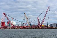 Op het terrein van Mammoet in Schiedam staan een paar enorm grote hijskranen. De allergrootste hijskraan van Mammoet is de PTC (=Platform Twinrail Containerized).