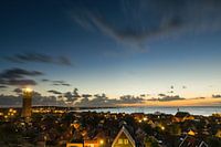 Terschelling met de markante vuurtoren Brandaris op de voorgrond terwijl de zon opkomt.