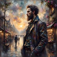 Een bebaarde man staat alleen temidden van het drukke ritme van de stad, zijn aanwezigheid een kalme noot in het rusteloze ritme om hem heen. Zijn jas, geweven met gedurfde strepen turkoois, amber en violet, vangt het vervagende licht en weerspiegelt de verschuivende kleuren van de lucht als de zonsondergang overgaat in de avond.…