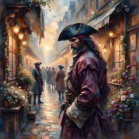 Een piraat, getooid met een verweerde driekantige hoed, loopt zelfverzekerd over een geplaveide straat met levendige bloemen, waarvan de kleuren worden verzacht door de zachte ochtendnevel. De ritmische echo van zijn laarzen op de stenen onderbreekt het rustige gezoem van het leven om hem heen, terwijl vage figuren in de mistige verte…