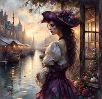 Een vrouw in elegante Victoriaanse kleding staat gracieus aan een rustig kanaal, haar silhouet badend in de zachte gloed van het avondlicht. Om haar heen omlijsten levendige bloemen het tafereel. Hun bloemblaadjes vangen de vervagende zon en voegen een zachte warmte toe aan de compositie. Langs de waterweg dobberen rustig boten, sommige…