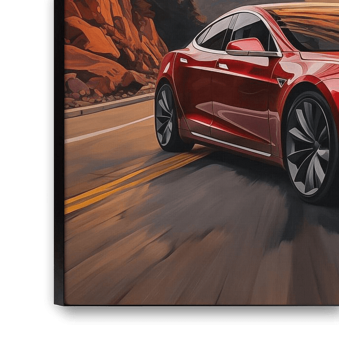 Tesla model s zonsondergang schilderij met een prachtige en unieke stijl. Met een uniek ontwerp en prachtige kleurtinten maakt dit tot een stijlvolle fotoprint die prachtig staat in elke ruimte. 100% uniek en origineel!