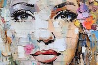 Tess Portret - abstract schilderij / mixed media kunst geschilderd. Mooi contrast tussen het verfijnde portret en rauwe collage/schildertechniek.