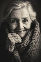 Met een warme glimlach en een zachte blik straalt deze charmante dame een gastvrije sfeer uit. Haar zachte, geweven sjaal omhult haar als een knuffel, terwijl de fijne lijnen van haar gezicht verhalen van levenservaringen. Dit schilderij is ideaal voor in de woonkamer en brengt gezelligheid en menselijke warmte in elke kamer.