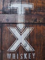 Deze foto toont een close-up van een houten whiskeyvat met een metalen band eromheen in Austin, Texas. Het vat heeft een verweerde uitstraling, met zichtbaar ouder hout en een metalen band die tekenen van roest vertoont. Centraal op het vat is een grote, witgeschilderde "T" en "X" afgebeeld, met daaronder het woord "WHISKEY" in kleinere…