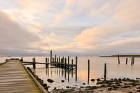 Blauwe uur of Gouden uur. Een mooi plekje aan de wad kant van Texel. Weerspiegelingen en reflectie in Zee van de houten steiger bij Zonsopkomst of Zonsondergang.