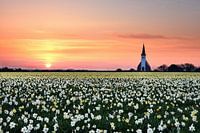 Kerkje Den Hoorn Texel bij zonsopkomst met op de voorgrond fraaie narcissen