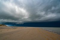 Stormachtige zonsopgang op het strand van Texel met een naderende onweerswolk over de Waddenzee aan de noordpunt van het eiland met uitzicht op de Waddenzee en Vlieland.