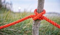 Het dikke oranje touw dient als leuning langs een pad richting het Texelse strand. Op Texel vind je veel van dit voor touw leuningen. Zo wordt alles uit zee komt of over is gerecycled. Je ziet het licht van de Texelse vuurtoren.