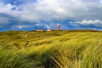 Vuurtoren op het waddeneiland Texel in de duinen tijdens een stormachtige herfstochtend. De vuurtoren van Eierland staat op de noordpunt van het eiland.
