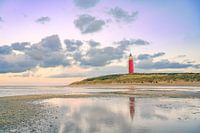 Vuurtoren op het Waddeneiland Texel in de duinen tijdens een rustige herfstavond met weerspiegeling op het Noordzeestrand. De vuurtoren van Eierland staat op de noordpunt van het eiland.