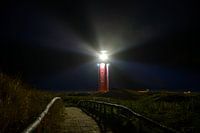 Vuurtoren op het waddeneiland Texel in de duinen bij nacht met een voetpad naar de vuurtoren. De lichtbundels van de vuurtoren zijn duidelijk zichtbaar in de lucht.