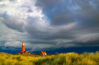 Vuurtoren op het Waddeneiland Texel in de duinen tijdens een stormachtige herfstochtend. De vuurtoren van Eierland staat op de noordpunt van het eiland.