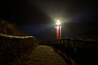 Vuurtoren op het waddeneiland Texel in de duinen bij nacht met een voetpad naar de vuurtoren tijdens een stormachtige herfstnacht. De Eierland vuurtoren staat op de noordpunt van het eiland.