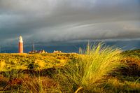 Vuurtoren op het Waddeneiland Texel in de duinen tijdens een stormachtige herfstochtend. De vuurtoren van Eierland staat op de noordpunt van het eiland.