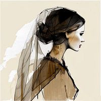 Prachtige vrouw in kant, textiel en sluier. Zwart wit portret op beige. Verfijnd en sober. Passend bij diverse trends, zoals Organic & Beige.