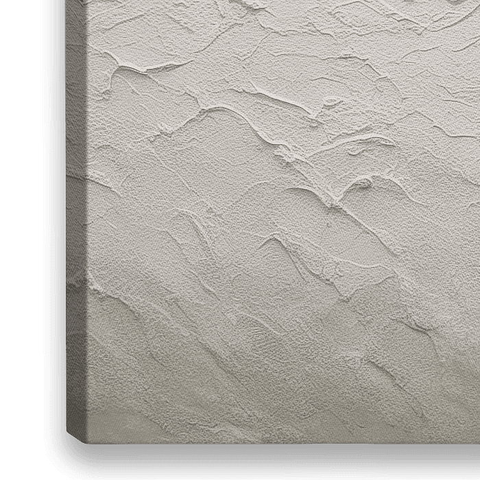 Oppervlak met rijke texturen dat doet denken aan een abstract landschap of een gestileerde weergave van een bergketen. De bovenste helft van het werk is uitgevoerd in zachte beige tinten die overgaan in een ruw, wit gedeelte met een hoge textuur die de onderste helft vult. De horizontale scheiding suggereert een horizon, en de textuur…