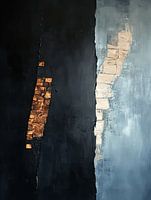 Dit kunstwerk heeft een sterke abstracte en minimalistische uitstraling, met een opvallend contrast tussen donkere en lichtere kleuren. De compositie lijkt in twee helften te zijn verdeeld: de linkerhelft bestaat voornamelijk uit diepe zwarttinten, waarin een reeks goudachtige blokken is ingebed, terwijl de rechterhelft is gedomineerd door lichte, blauwgrijze tinten met fragmenten van beige of steenachtige texturen. Het gebruik van verschillende texturen en de scheiding tussen de twee helften creëren een gevoel van dualiteit of tegenstellingen.