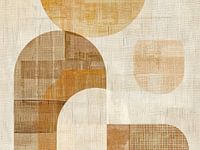 Textured Harmony - Dit abstracte schilderij toont een harmonieuze compositie van overlappende cirkels en semi-cirkels, geaccentueerd met diverse texturen en aardetinten. De cirkels, soms volledig, soms als boog, vormen een dynamisch maar toch rustig beeld. Sommige segmenten hebben een raster- of gaasachtige textuur, anderen zijn meer uniform van kleur met subtiele tonale variaties. De kleuren variëren van beige tot diep terracotta, met nuances van zachte witte en zandkleuren, die het geheel een warme uitstraling geven. Dit abstracte schilderij speelt met geometrie en diepte, en creëert door overlappende figuren een gevoel van driedimensionaliteit, waarbij elke laag een eigen verhaal lijkt te vertellen.