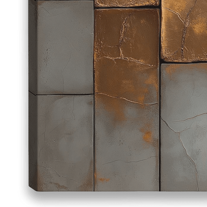 Textured Symmetry - Golden Cascade presenteert een adembenemend samenspel van rechthoekige en vierkante panelen, waarin de overvloed aan gouden tinten moeiteloos samensmelt met koele grijze tonen. Het kunstwerk speelt met textuur en diepte, waarbij de verfijnde barsten in het gouden oppervlak een verhaal vertellen van elegantie en…
