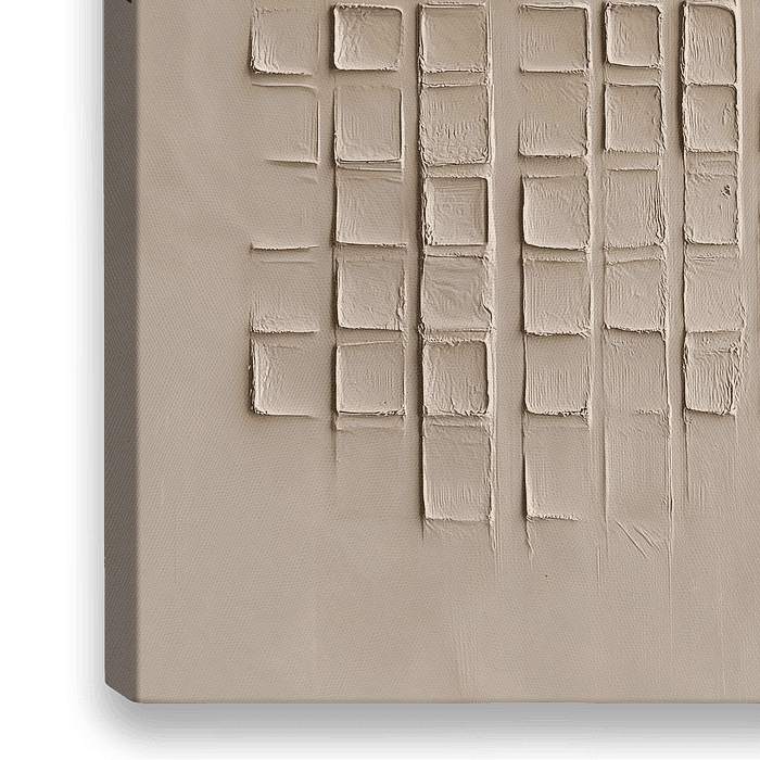 minimalistische compositie, bestaande uit een raster van kleine vierkante elementen die subtiel uit het oppervlak van de achtergrond lijken te komen. De structuur is volledig monochroom, in zachte beige tinten, wat een ingetogen en serene sfeer creëert. De vierkantjes hebben een lichte onregelmatigheid in hun vormen en plaatsing,…