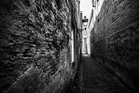 Een steegje zoals er duizenden zijn in de steden van Nederland. Fotograaf Bert-Jan de Wagenaar wordt er altijd weer door aangetrokken. Hoewel de meeste binnensteden de laatste decennia flink zijn opgeknapt vinden we in de steegjes vaak nog de oude ruwe stad. Eeuwen oude muren, jarenlang verwaarloosd zorgen voor prachtige texturen. De kijklijnen van een smalle steeg geven een spannend beeld. Saillante details zoals de gaslamp in deze foto maken het sfeerbeeld compleet. Deze foto was al in kleur verkrijgbaar en nu ook in zwart wit.
