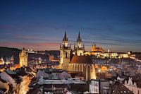 Praag, Uitzicht vanaf de Poedertoren naar de Tyn Kerk en de Hradčany Heuvel bij het Blauwe Uur