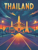 Stap in de mystieke allure van Thailand met deze nachtelijke tempelposter, met glinsterende torenspitsen verlicht onder een dramatische sterrenhemel. De stralende tempelarchitectuur fonkelt met gouden accenten, omringd door gloeiende straatverlichting en weelderig groen, die de betoverende sfeer oproepen die alleen in de tijdloze steden van Thailand te vinden is. Dit beeld viert zowel spirituele sereniteit als het bruisende nachtleven, en roept reislust en een gevoel van ontdekking op bij wereldwijde reizigers en liefhebbers van Aziatische bestemmingen. Perfect voor meditatieruimtes, woonkamers of elke muur die een vleugje exotische elegantie nodig heeft. Deze retro-geïnspireerde poster combineert klassiek reisontwerp met moderne illustratie om een echt magisch effect te creëren. Elke blik onthult meer van Thailand's rijke geschiedenis en iconische landschap, en voert kijkers mee naar een land waar traditie, energie en schoonheid samenkomen onder één hemel.