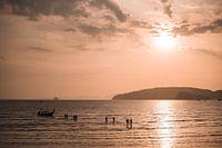 Mensen die na een boottour terug lopen naar het strand met op de achtergrond een zonsondergang.