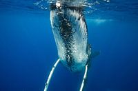 Humpback whales have different characters. Some are not interested to swim with people at all, and some are quite curious about those strange creatures with snorkels and masks. This humpback came up and spy hopped right in front of me. Because of the wide angle lens it looks further away than it in reality was. I estimate I was as close as 1.5mtr from its chin haha.