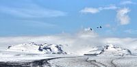 Ganzen komen voorbij gevlogen met een prachtige achtergrond van IJslandse bergen met sneeuw en ijs.