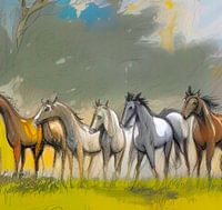 De 5 kijkende paarden. Een digitaal schilder kunstwerk.