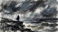 Het beeld toont een eenzame figuur aan de rand van een ruwe klif, staand tegenover een overweldigende oceaanstorm. De compositie wordt gedomineerd door chaotische wolkenpartijen en…