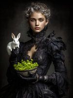 Portret van een meisje in een zwart kanten jurk met een klein wit konijntje.
