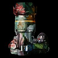 Digitale, creatieve bewerking van een foto van een spiegel reflex camera. Nu is het eens niet de camera die de kunst vastlegt, maar is de camera zelf een kunstwerk geworden.