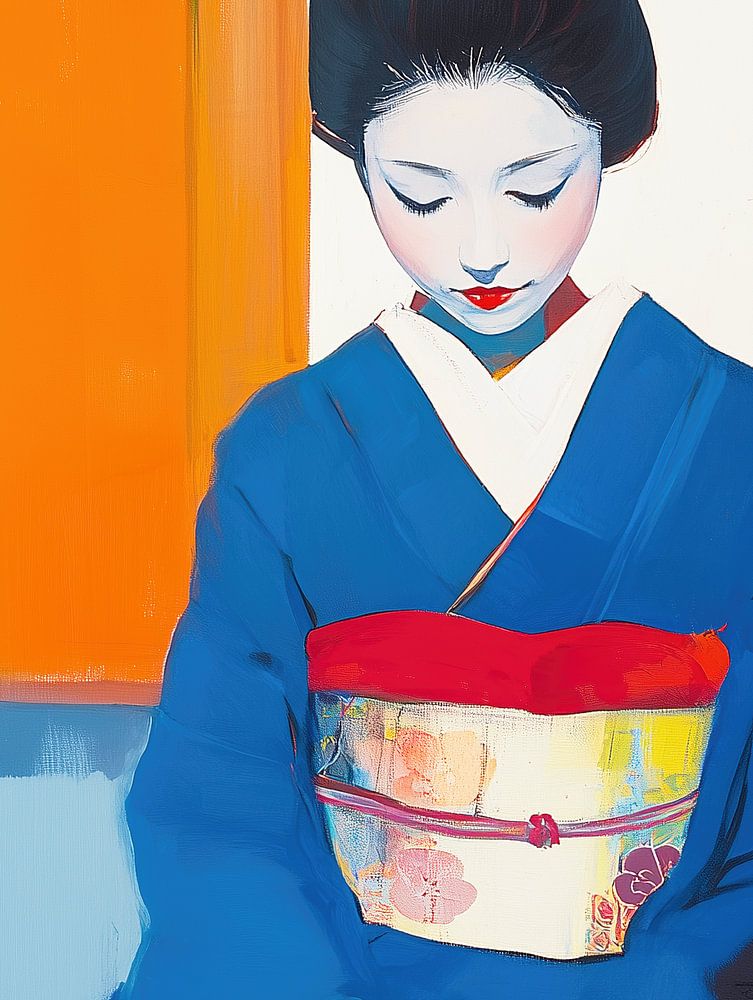 Een modern abstract kleurrijk schilderij van een Japanse vrouw.