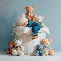 Een hartverwarmend schilderij toont een baby die vredig slaapt, gekleed in een spijkerpakje en een pluizig wit mutsje, omringd door diverse teddyberen die lijken te waken over de baby. De algehele indruk is er een van onschuld, geborgenheid en kinderlijke gelukzaligheid.