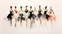 Een minimalistisch kunstwerk van negen ballerina's in tutu’s geschilderd met aquareltechnieken in een neutraal kleurenpalet van wit, zwart en een subtiel accent van rood. Hun poses zijn elegant en de algehele stemming is sereen.