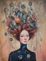 Dit poëtische portret toont een mysterieuze schoonheid wiens haar een levende hemel wordt vol luchtballonnen en bloemenelementen. De kunstenaar heeft een wereld gecreëerd waarin vintage romantiek en surrealistische fantasie elkaar ontmoeten. Elke ballon is individueel ontworpen - van elegante gestreepte patronen tot ornamentele versieringen die doen denken aan de historische luchtvaart.