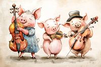 Drie vrolijke varkens met strijkinstrumenten maken muziek.