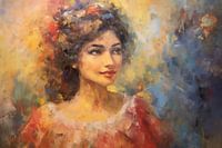 In dit betoverende digitale schilderij van Circe, de tovenares van Aeaea, doordringt een betoverende sfeer het doek. Haar ogen, poelen van occulte kennis, weerspiegelen zowel wijsheid als een vleugje raadselachtige ondeugendheid.
