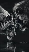 Dit kunstwerk vangt een krachtig en intiem moment tussen twee leeuwen, weergegeven in een prachtig zwart-wit palet.